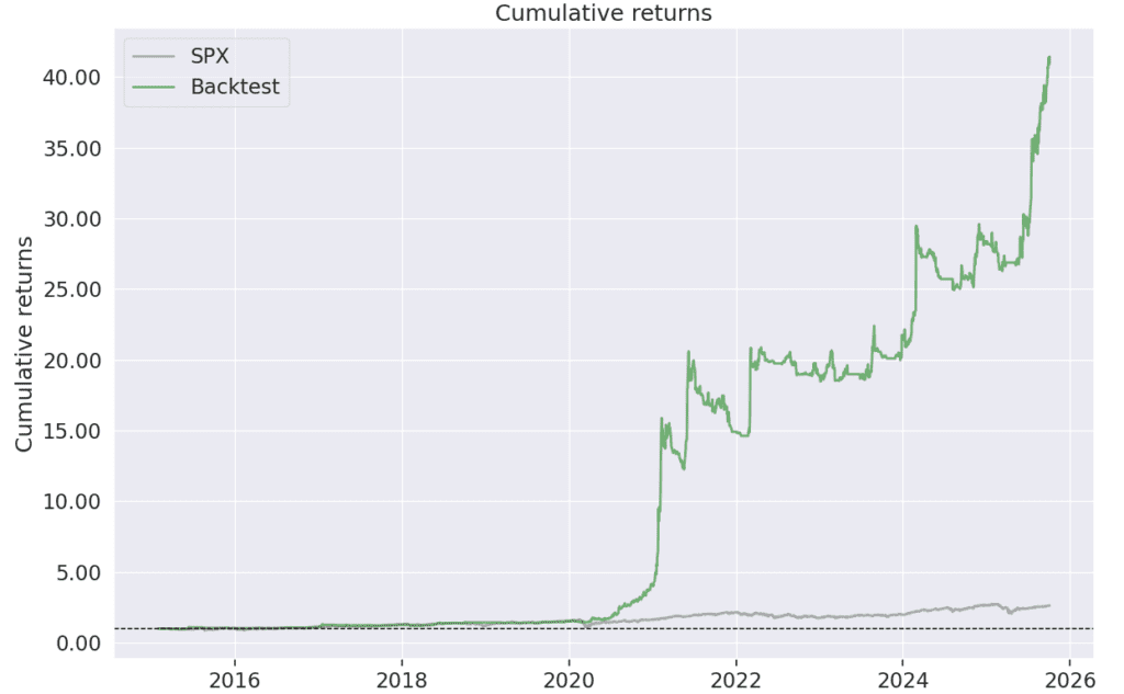 In this post, we explore the trading strategy “World 1D”, which has demonstrated impressive performance metrics, including a 40% CAGR and a Sortino ratio of 1.8 over a 10 year backtest. This strategy operates within the vast scope of the US and European stock markets, encompassing 7,666 symbols.